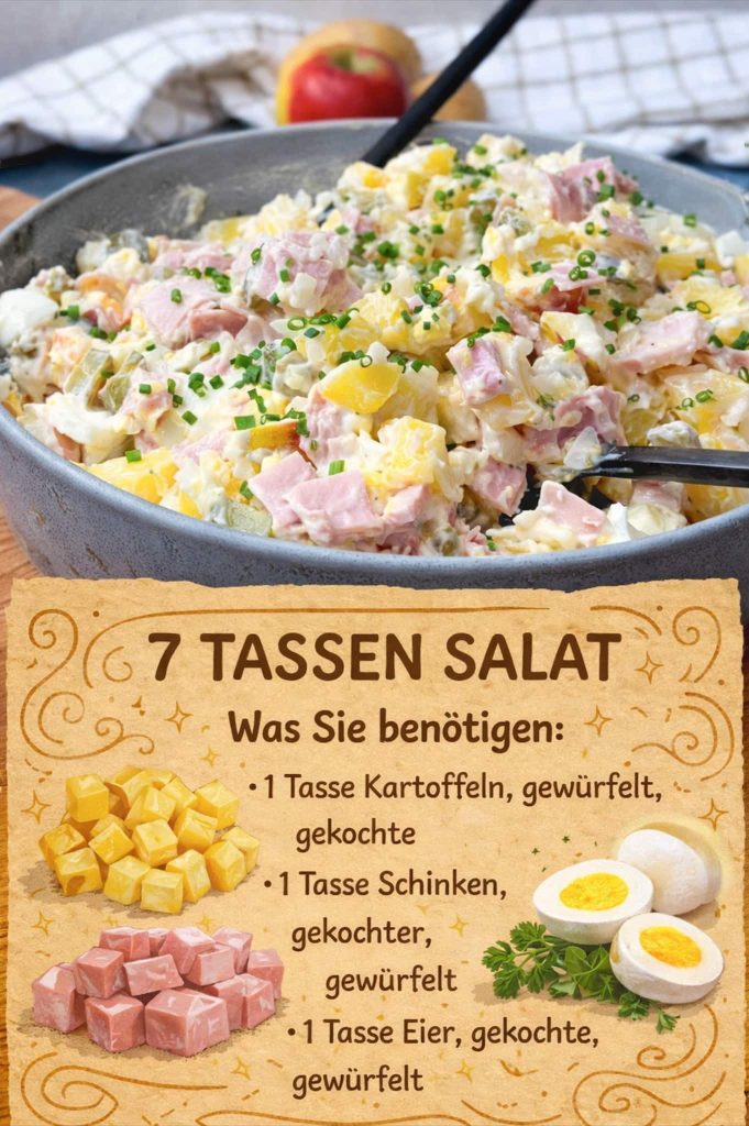 Im Kern handelt es sich um einen cremigen Kartoffelsalat mit Gemüse, Ei, Schinken und Apfel, der durch Mayonnaise gebunden wird. Was ihn besonders macht, ist die frische Gurke und der Apfel, die für eine angenehme Leichtigkeit sorgen und einen spannenden Kontrast zu den herzhaften Komponenten bilden.