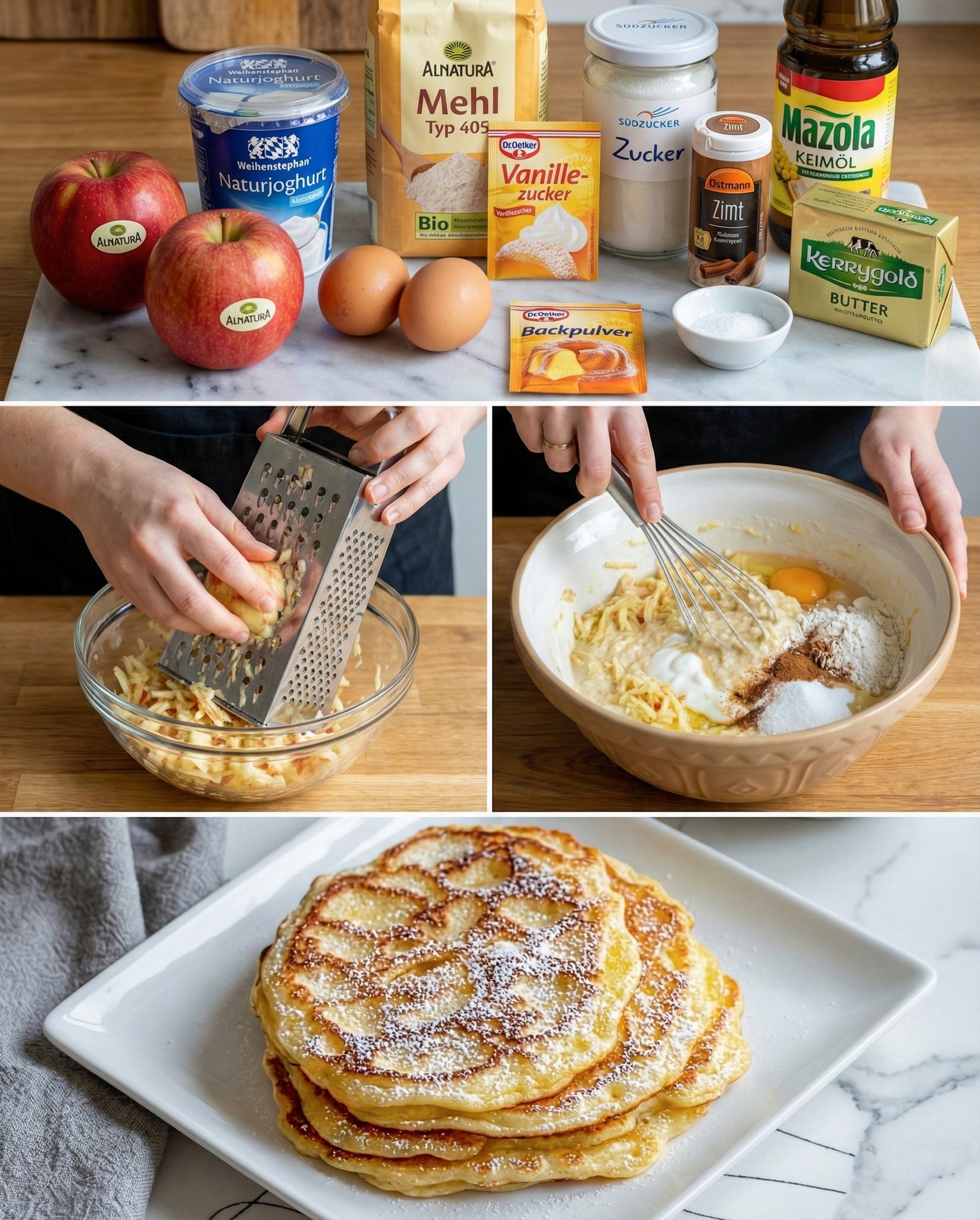 Jede dieser Zutaten erfüllt eine bestimmte Funktion. Während das Mehl die Grundlage des Teigs bildet, sorgen Eier und Joghurt für eine cremige und stabile Struktur. Die Äpfel wiederum liefern Fruchtigkeit und Feuchtigkeit, wodurch die Pfannkuchen besonders weich bleiben.