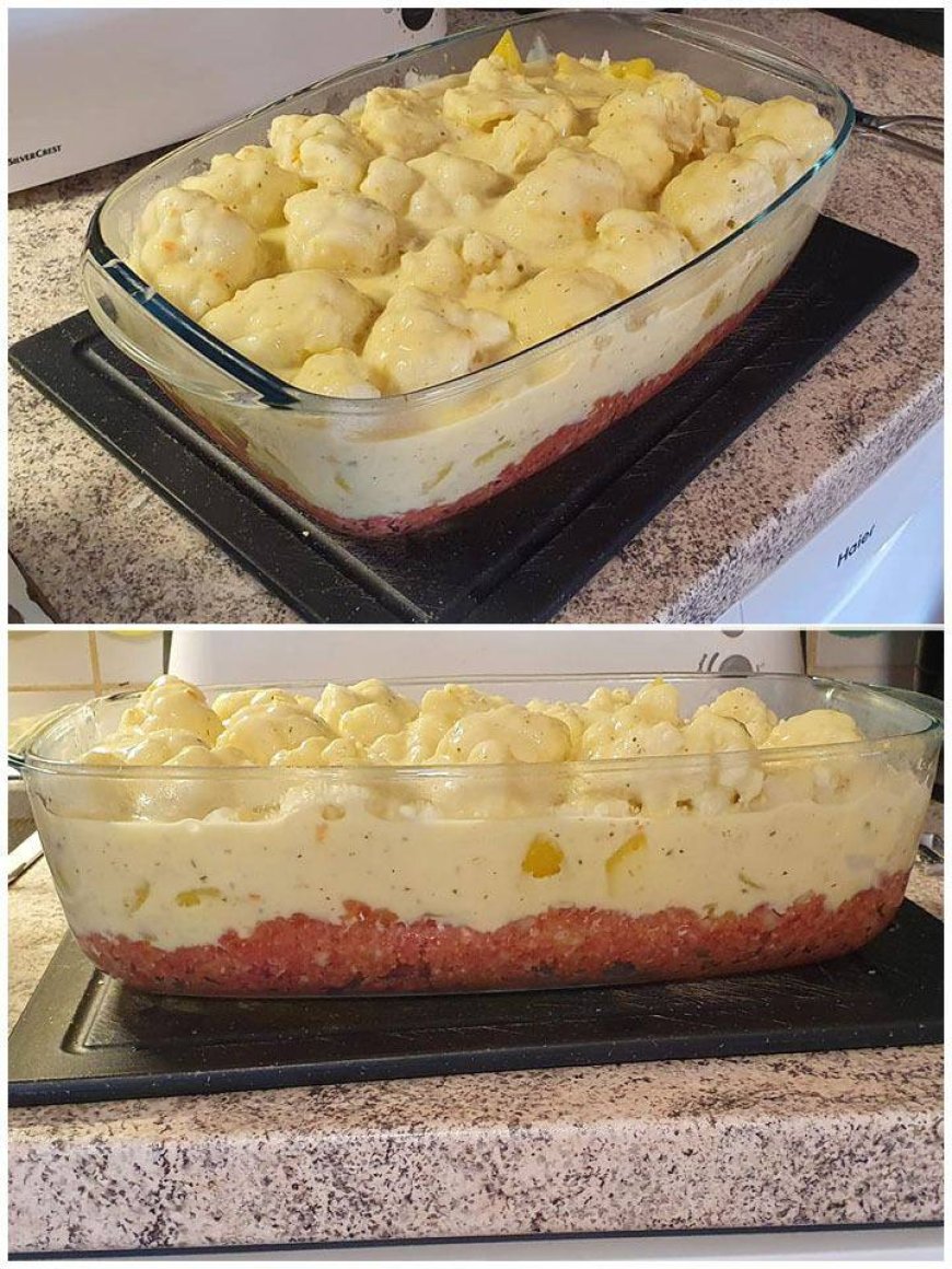Die fertige Soße über den Blumenkohl und das Hackfleisch gießen und alles gleichmäßig verteilen. Wer möchte, kann zusätzlich etwas geriebenen Käse darüber streuen, um eine goldbraune Kruste beim Backen zu erhalten.
