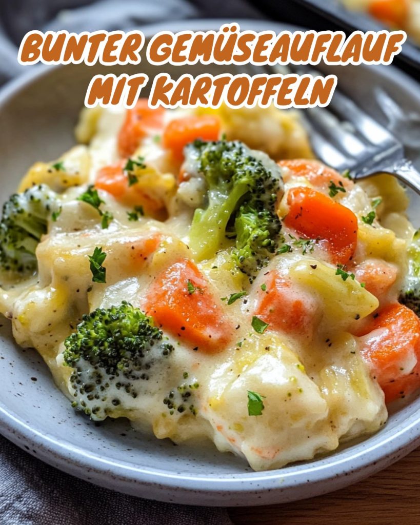 Der ursprünglich relativ kurze Rezepttext beschreibt einen Auflauf, der sich vor allem durch seine cremige Konsistenz und die Mischung verschiedener Gemüsesorten auszeichnet. Dabei steht die Kartoffel als Grundlage im Mittelpunkt. Sie dient nicht nur als sättigende Basis, sondern bildet auch eine ideale Struktur für den Auflauf. Das Gemüse – insbesondere Karotten, Paprika und Brokkoli – bringt Farbe und leichte Süße, während die Béchamelsauce alles zu einem cremigen Gesamtwerk verbindet. Abgerundet wird das Gericht durch eine goldene Käsekruste, die beim Backen leicht knusprig wird.