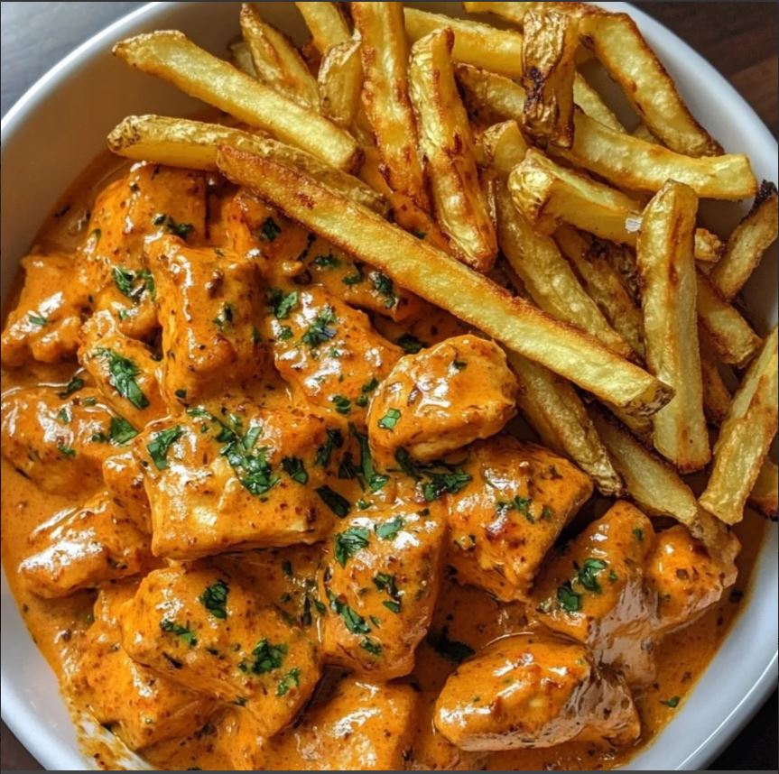 Die Kombination aus cremigem Hähnchen und knusprigen Pommes ist nicht nur optisch ansprechend, sondern auch geschmacklich unvergleichlich.