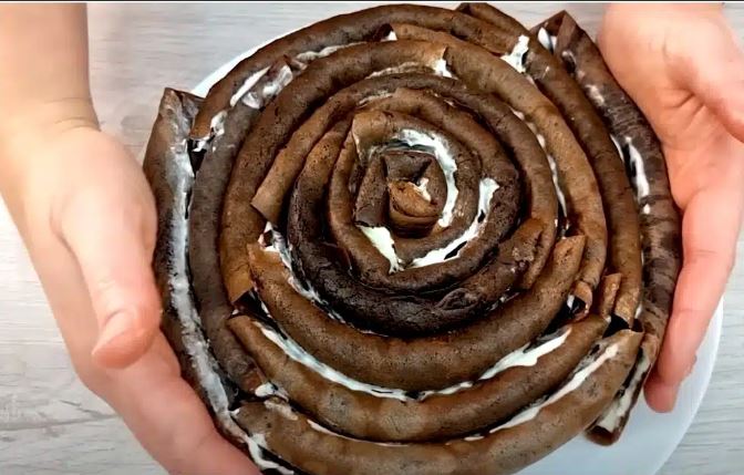 Die zusammengesetzte Creme wird nun auf die einzelnen Pfannkuchen gestrichen. Jeder Pfannkuchen wird gleichmäßig bestrichen und anschließend gefaltet. Danach wird jeder Pfannkuchen leicht mit der restlichen Sahne eingefettet, bevor er vorsichtig aufgerollt wird.