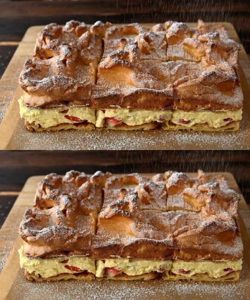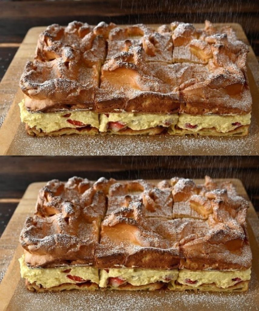 Der Kuchen basiert auf einem luftigen, stabilen Teig, der an traditionellen Brandteig erinnert, jedoch auf das Backblech angepasst wurde. Diese Teigart ist bekannt für ihre besondere Struktur: außen leicht knusprig, innen zart und hohl – perfekt geeignet, um eine reichhaltige Creme aufzunehmen.