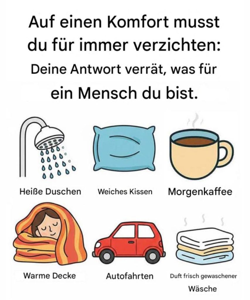 Es gibt Entscheidungen im Leben, die auf den ersten Blick simpel erscheinen – und doch viel über die Persönlichkeit eines Menschen verraten können. Eine besonders interessante Frage lautet: Auf welchen Komfort würdest du für immer verzichten? Nicht nur gelegentlich, nicht nur unter bestimmten Bedingungen, sondern für immer. Die Wahl einer solchen Option offenbart nicht nur Vorlieben, sondern auch tiefere psychologische Muster, Lebensprinzipien und Selbstwahrnehmung. Im Folgenden analysieren wir die verschiedenen Optionen und ihre Bedeutung.