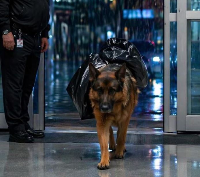 Dann wurde alles plötzlich von lautem Bellen unterbrochen. Zunächst wusste niemand, woher es kam, doch dann öffneten sich die automatischen Türen, und ein Hund trat ein. Ein großer Deutscher Schäferhund, völlig durchnässt vom Regen, mit einem schwarzen Müllsack auf dem Rücken. Er ging bis zur Rezeption und hinterließ nasse Spuren auf dem Boden. Das Personal war verwirrt und erschrocken, und der Sicherheitsmann versuchte sofort, ihn aufzuhalten. Doch der Hund ignorierte seinen Befehl und ging weiter auf den Tresen zu, als wüsste er genau, wonach er suchte.