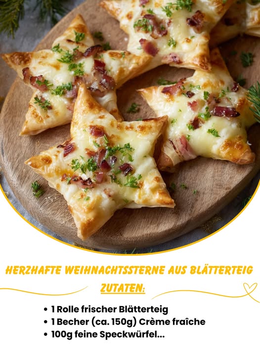 Die Weihnachtsstern-Blätterteig-Häppchen sind ein einfach zuzubereitender, aber dennoch festlicher Snack, der durch seine knusprige Textur, den herzhaften Belag und die vielfältigen Anpassungsmöglichkeiten überzeugt. Sie eignen sich ideal für Weihnachten, Adventsfeiern, Partys oder als Appetizer für Gäste.