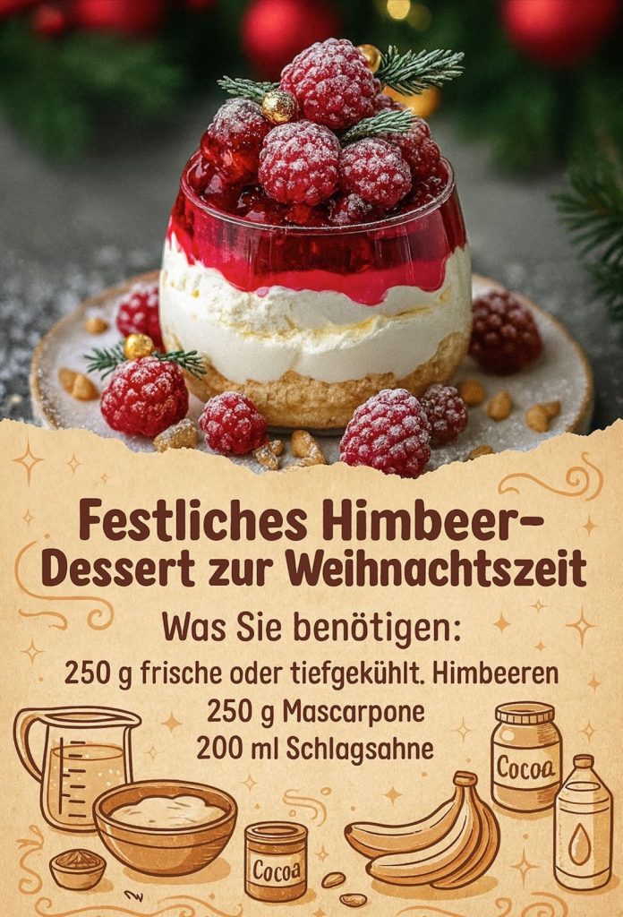 Damit sich alle Aromen optimal verbinden können, sollte das Dessert mindestens 1 bis 2 Stunden im Kühlschrank ruhen. Während dieser Zeit zieht die Creme durch, die Himbeeren geben leicht Saft ab und das Aroma wird intensiver.