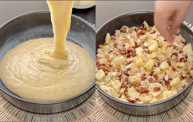 Der vorbereitete Teig wird in eine mit Butter eingefettete und mit Mehl bestäubte Backform gegeben. Darauf wird die Apfel-Nuss-Mischung gleichmäßig verteilt. Dieser Schritt ist entscheidend, damit jede Portion des Kuchens sowohl Teig als auch fruchtige Nussstücke enthält.