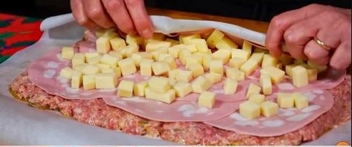 Auf einem Stück Backpapier wird die Fleischmasse zu einem rechteckigen Fladen gedrückt. Auf dieser Fläche wird nun zunächst die Mortadella verteilt. Danach folgen die gewürfelten Stücke Emmentaler, die später im Ofen schmelzen und im Inneren des Bratens einen köstlichen Kern bilden.