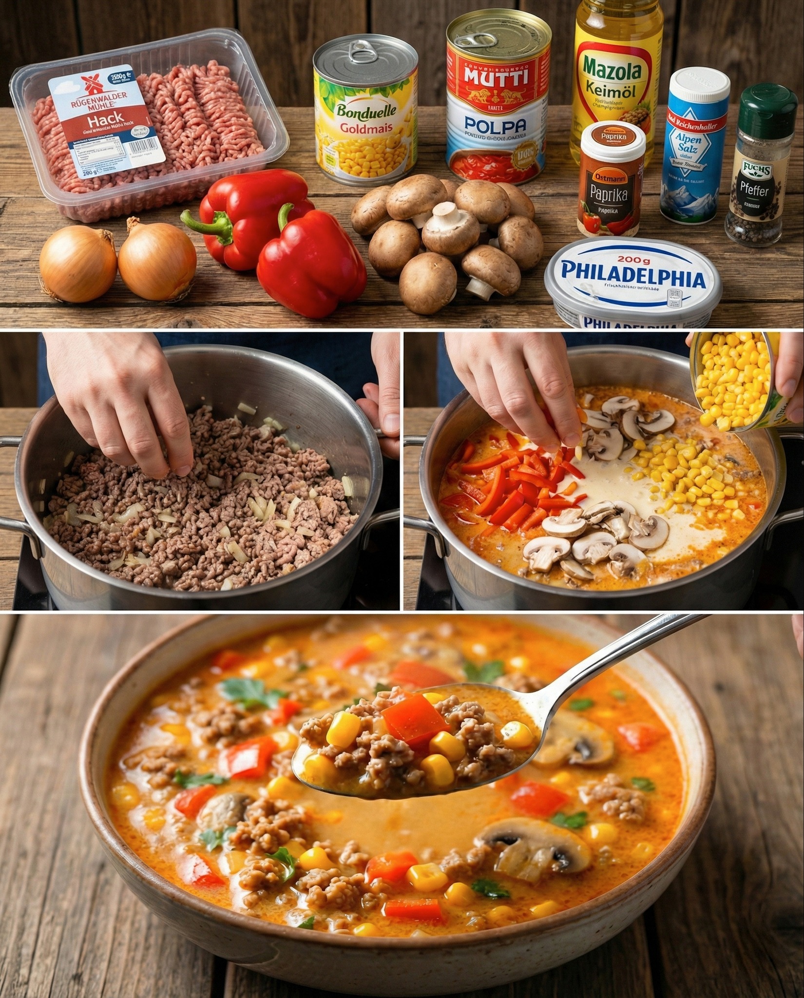 Die folgende Speise ist eine herzhafte und besonders aromatische Suppe, die sich ideal für kalte Tage oder für ein gemütliches Familienessen eignet. Sie kombiniert würziges Hackfleisch, frisches Gemüse und eine cremige Komponente, die der Suppe eine besonders angenehme Konsistenz verleiht. Durch die Kombination verschiedener Zutaten entsteht ein Gericht, das sowohl sättigend als auch geschmacklich ausgewogen ist. Die Mischung aus Gemüse, Fleisch und cremigem Käse sorgt für ein intensives Aroma und eine wunderbar cremige Textur.