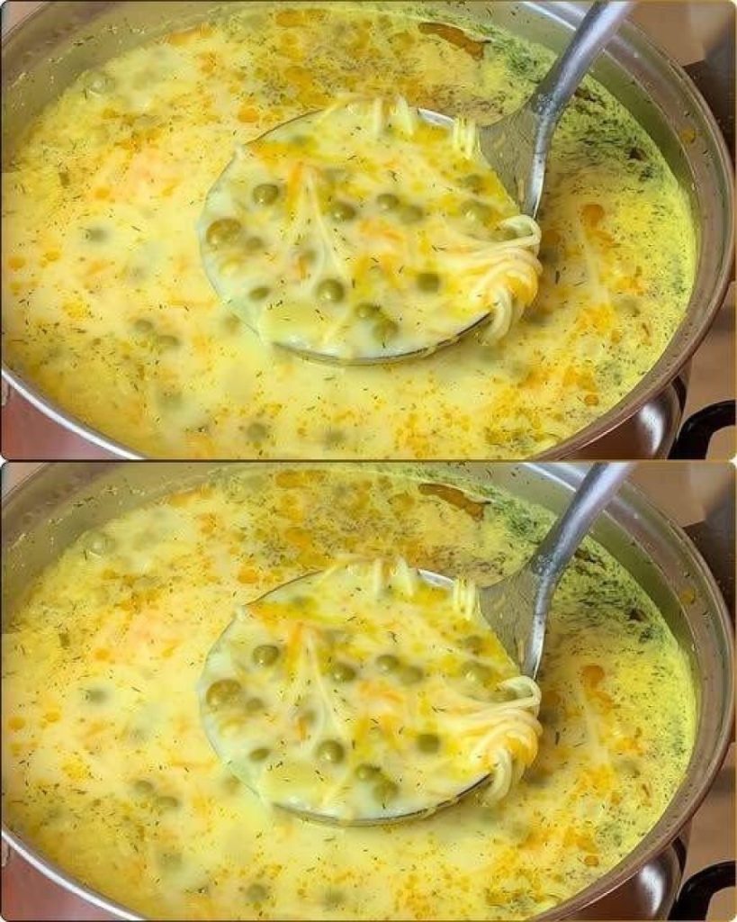 Die Kombination aus Erbsen, Nudeln und sahniger Brühe, verfeinert mit Dill, erzeugt ein Gericht, das zugleich leicht, nahrhaft und klassisch wirkt. Jede Portion erinnert ein wenig an die Suppen von früher – an Familienmomente, an das Gefühl von Zuhause und an den Trost, den nur eine gute hausgemachte Suppe schenken kann.