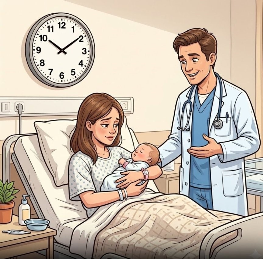 Stellen wir uns eine ruhige Szene vor, die auf den ersten Blick keinerlei Fragen aufwirft. Es handelt sich um ein Krankenhauszimmer auf einer Entbindungsstation. Die Atmosphäre ist ruhig, sauber und strukturiert. Eine frischgebackene Mutter hält ihr Neugeborenes liebevoll im Arm. Neben ihr steht ein Arzt, der die Situation aufmerksam begleitet. Verschiedene medizinische Geräte befinden sich ordentlich im Raum verteilt. Alles wirkt harmonisch und logisch aufgebaut.