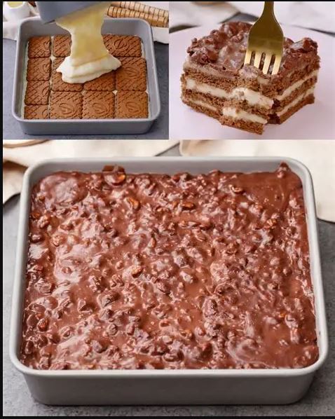 Die Zubereitung des Kekskuchens ist einfach und überschaubar. Es werden mehrere Schichten von Keksen und Pudding hergestellt, bevor das Topping aus Schokolade und Nüssen darüber gegeben wird.