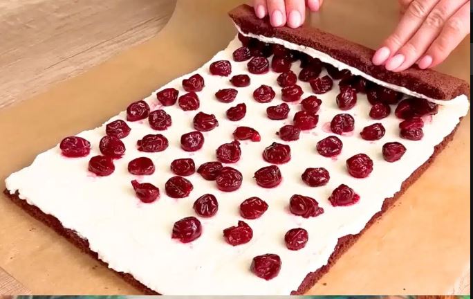 Die vorbereitete Ricotta-Butter-Creme wird gleichmäßig auf dem Biskuit verteilt. Danach werden die abgetropften Kirschen darauf gesetzt. Wichtig ist, die Kirschen gleichmäßig zu verteilen, um beim Aufrollen der Roulade ein harmonisches Muster zu erhalten.