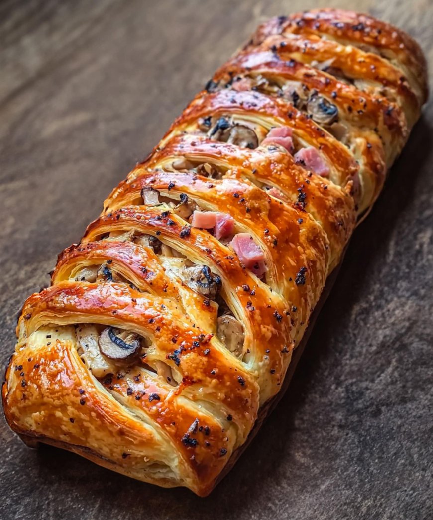 Herzhafter Blätterteigzopf mit Champignons, Schinken und Käse – ein vielseitiger Genuss für jede Gelegenheit