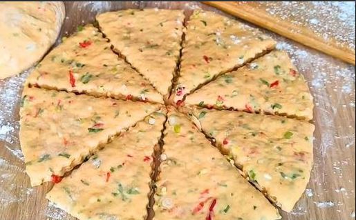 Drücken Sie den Teig leicht flach und formen Sie ihn zu dreieckigen Stücken.