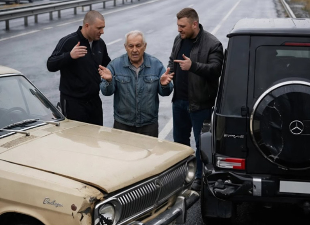 Leider verschlechterte sich die Lage rasch, als der SUV abrupt bremste und den Rentner zum Bremsen zwang. Unter den nassen Bedingungen konnte sein Fahrzeug nicht sofort anhalten, was zu einem Zusammenstoß führte. Dieser Zusammenstoß war nicht nur physisch, sondern auch ein emotionaler Schock für den alten Mann. Aus dem SUV sprangen Rowdys, und einer von ihnen, mit rasiertem Kopf und aggressiver Haltung, begann auf die Motorhaube des alten Autos zu schlagen. Ein anderer, kräftiger gebaut, begann zu drohen und demonstrierte seine Überlegenheit durch körperliche Einschüchterung. In diesem Moment sah sich der Rentner einer Herausforderung gegenüber, die viele Menschen völlig gebrochen hätte. Dennoch blieb er ruhig, wissend, dass es am wichtigsten war, besonnen zu reagieren.