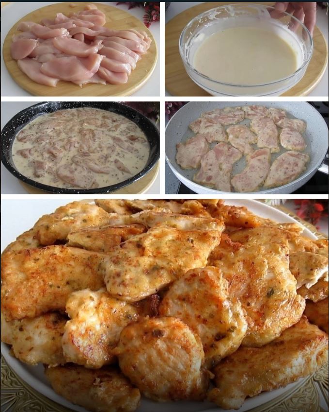 Schneiden Sie die Hähnchenfilets in dünne Scheiben, am besten quer, damit sie kleiner sind und sich leichter braten lassen.