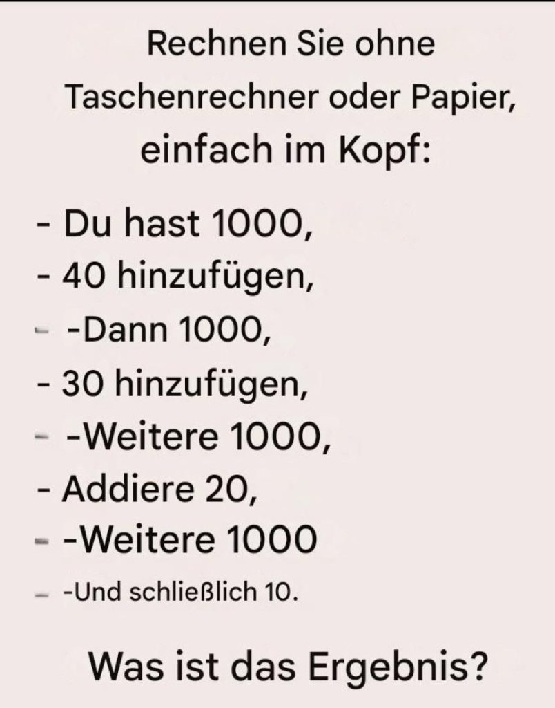 Auf den ersten Blick wirkt sie trivial. Viele Menschen sind überzeugt, die Lösung sofort zu erkennen. Doch erstaunlicherweise landen zahlreiche Personen bei einem falschen Ergebnis – oft bei 5000, obwohl das korrekte Resultat 4100 lautet.