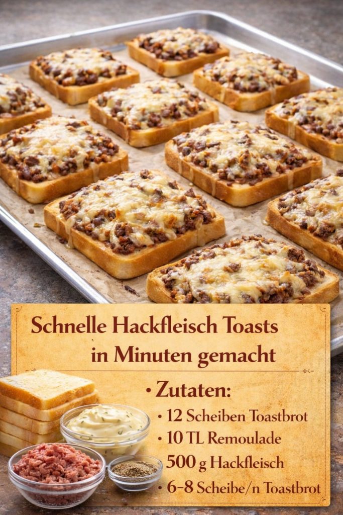 Einfach, schnell und dennoch unglaublich lecker – genau so lassen sich diese überbackenen Hackfleisch-Toasts beschreiben. Dieses Gericht verbindet die Rustikalität von gewürztem Hackfleisch mit der Knusprigkeit von Toastbrot und der cremigen Schmelze von Käse. Besonders beliebt ist es, weil es ohne großen Aufwand auskommt und sich flexibel an unterschiedliche Geschmäcker anpassen lässt. Ob als schnelles Abendessen, Snack für Gäste oder sättigende Mahlzeit für die ganze Familie – dieses Rezept ist ein echter Allrounder.