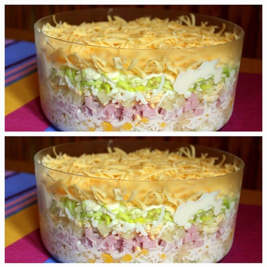 In eine große Salatschüssel werden nun die vorbereiteten Zutaten schichtweise eingefüllt. Die Reihenfolge ist dabei entscheidend, um Geschmack und Optik zu maximieren: