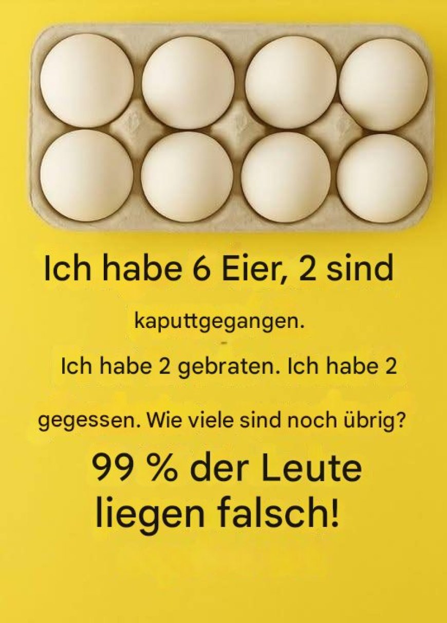 „Ich habe sechs Eier. Zwei verwende ich zum Aufschlagen, zwei zum Braten und zwei zum Essen. Wie viele Eier bleiben übrig?“