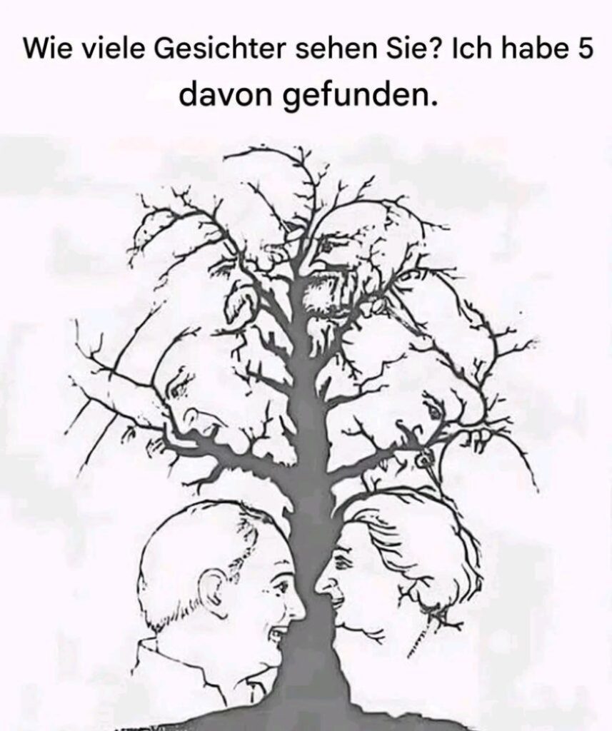 Auf den ersten Blick scheint alles ganz einfach: Man erkennt einen Baum, dessen Äste sich in alle Richtungen verzweigen. Vielleicht fällt dem einen oder anderen Betrachter sofort ein einzelnes Gesicht auf, das sich scheinbar zufällig aus der Struktur von Rinde und Zweigen ergibt. Andere wiederum meinen, zwei Gesichter zu entdecken. Doch je länger man das Bild betrachtet, desto deutlicher wird, dass es sich hier keineswegs um eine gewöhnliche Illustration handelt. Vielmehr offenbart sich Schritt für Schritt eine raffiniert konstruierte optische Täuschung, die unser Gehirn, unsere Wahrnehmung und unsere Vorstellungskraft auf eine harte Probe stellt.