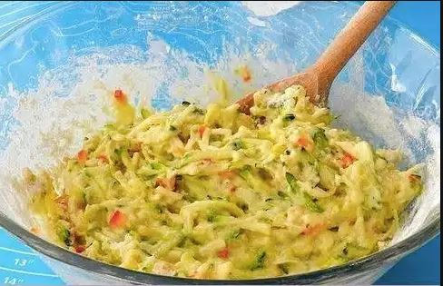 Nun wird die geriebene Zucchini unter die Eiermasse gehoben. Die Zucchini sorgt für Feuchtigkeit und einen leicht süßlichen Geschmack, der gut mit dem Käse harmoniert. Danach wird die fein gewürfelte rote Paprika untergemischt. Diese bringt nicht nur Farbe ins Spiel, sondern auch eine subtile Süße, die das Geschmackserlebnis abrundet. -