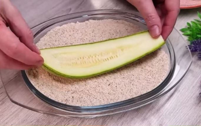 Die Zucchinischeiben nacheinander in Mehl, Eiermischung und Semmelbrösel tauchen. Durch diese Reihenfolge entsteht eine perfekte, knusprige Schicht, die beim Braten oder Backen aromatisch und goldbraun wird.